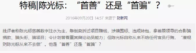 不曾想,2016年9月,陈光标却被《财新周刊》刊文曝出“慈善数字注水、靠倒卖拆迁项目赚钱,涉嫌围标、违规转包,拿着跟领导的合影骗捐款、骗头衔、骗项目……”为此,陈光标还专门召开了发布会。在现场,标哥没了公益的面具一脸怯意,曾经的得意满荡然无存。