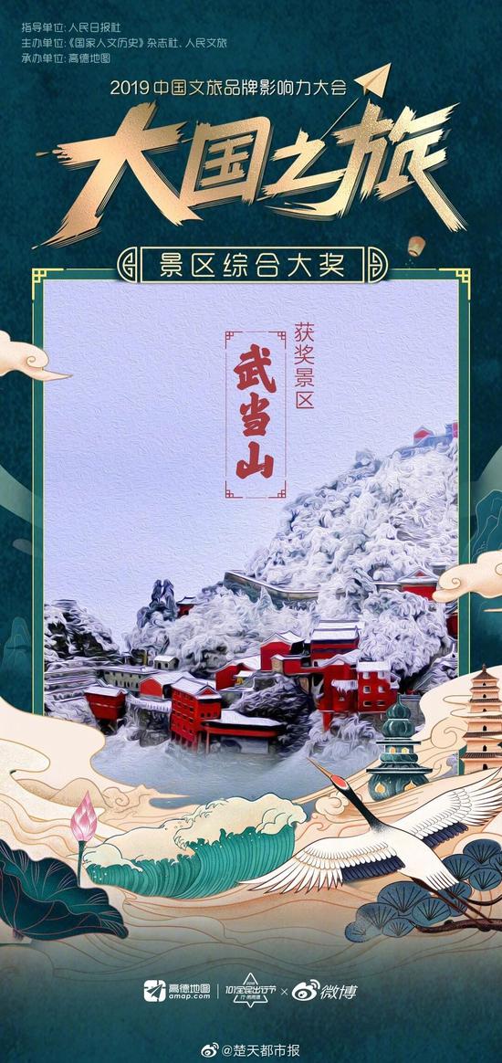 9月17日,“2019中国文旅品牌影响力大会·大国之旅景区”评选颁奖盛典在杭州成功举办,在经过全国票选和专家评审之后,武当山夺得“景区综合大奖”。