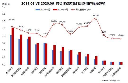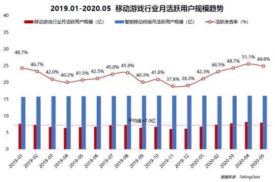 受到新冠肺炎疫情影响,2020年春节以来,人们普遍减少外出旅行,学校延迟开学,线上办公增多,“宅家”成为一种常态化生活方式。在智能移动终端月活跃用户规模总体稳定的背景下,移动游戏平均月活跃玩家数量达到7亿人。从2020年1月至6月,连续6个月里,月活跃渗透率超过42%,其中4月份的月活跃渗透率一度超过51%。而在疫情之前的2019年11月、12月,这一指标仅为38%左右。这表明受到疫情期间“宅经济”影响,原本已经体量可观的移动游戏行业,再次迎来一波逆势增长。