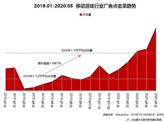 月活跃玩家数量和月活跃渗透率的增加,使得原本市场上已经常态化的买量势头变得更加强劲。在春节假期各地下发“居家令”,以及疫情导致延期复工复产复学等社会环境因素影响下,2020年移动游戏行业的相关广告投放趋势明显走强。数据显示,2020年1-5月平均广告点击量相比2019年1-12月平均点击量增长188.5%,移动游戏行业广告投放迎来了新一轮爆发。