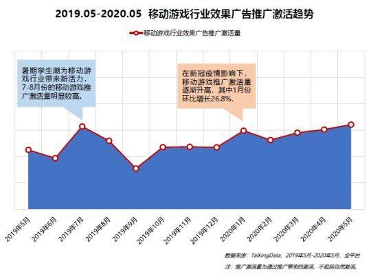 从2019年5月至2020年5月的移动游戏行业效果广告点击量趋势看,原本正常情况下,逢暑假和电商大促期间,移动游戏广告投放出现明显提高,学生和白领等群体的游戏兴趣被短时间集中激活,其余时间则普遍下降或是放缓。但是在2020年新冠疫情的影响下,人们对出行更加谨慎,逐渐将娱乐需求转向线上,包括游戏、视频等娱乐行业出现大幅上涨。例如下面图表显示,作为效果广告推广激活的黄金窗口期,2019年7-8月的推广量明显偏高,而2020年新冠疫情释放大量线上娱乐需求后,移动游戏行业在2020年1-5月的推广激活量均达到或超过了2019年暑期的最低水平,说明当疫情改变了人们的部分日常生活习惯后,对于移动游戏行业起到了较强的助推作用。