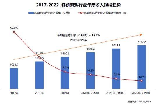 结合当前数据所做出的分析显示,今后一段时间里,移动游戏行业总体收入仍将保持较高增速,预计2022年达到2177亿元。但复合增长率(即投资在特定时间内的年度增长率)可能会由2019年的17.1%,降至2020年预计的14.2%,2017-2022的年均复合增长率预计为15.9%